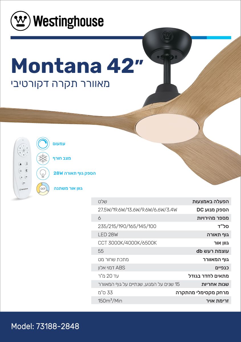 מאוורר תקרה 42″ דגם MONTANA עם מנוע DC כולל שלט+תאורה 28W ניתנת לעימעום באמצעות השלט ו- 3CCT – שלושה גווני תאורה לבחירה. צבע המאוורר שחור ומגיע עם 3 כנפיים בצבע דמוי עץ אלון. WESTINGHOUSE