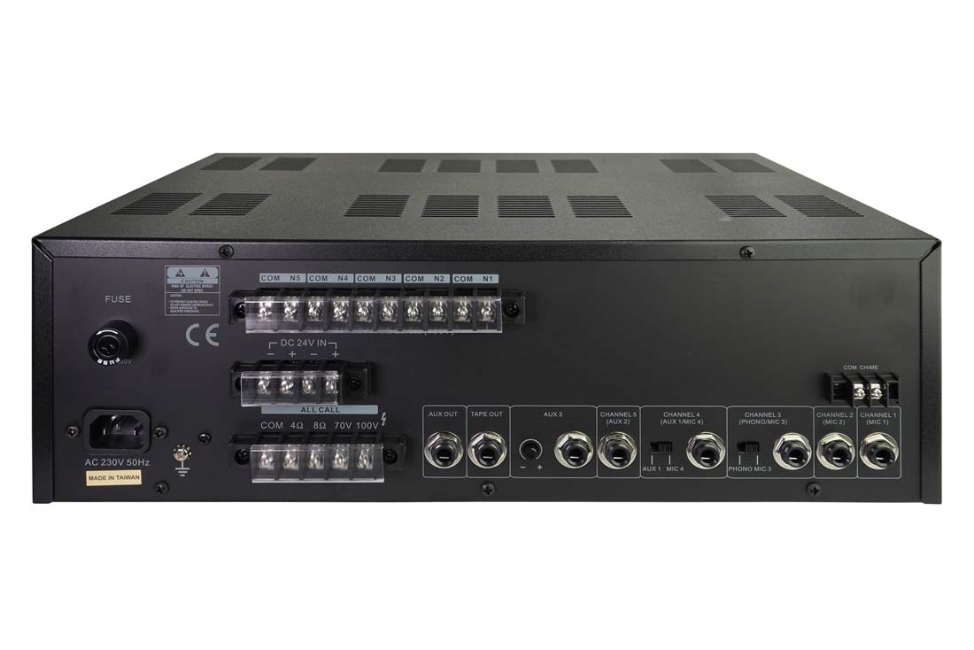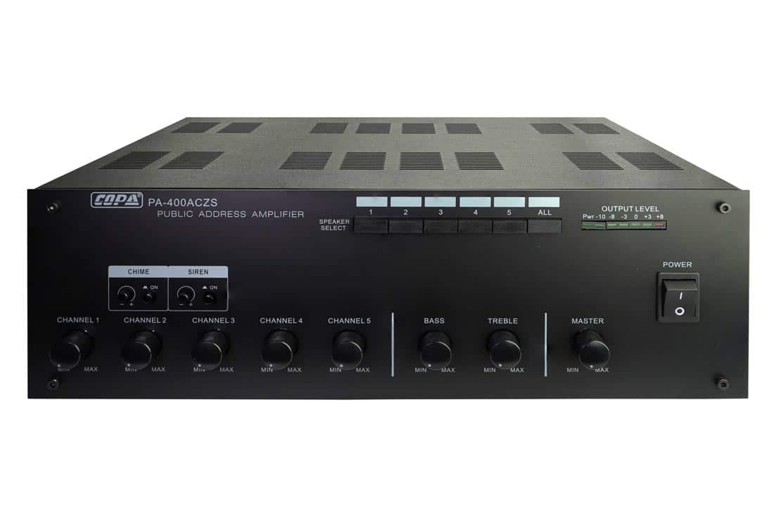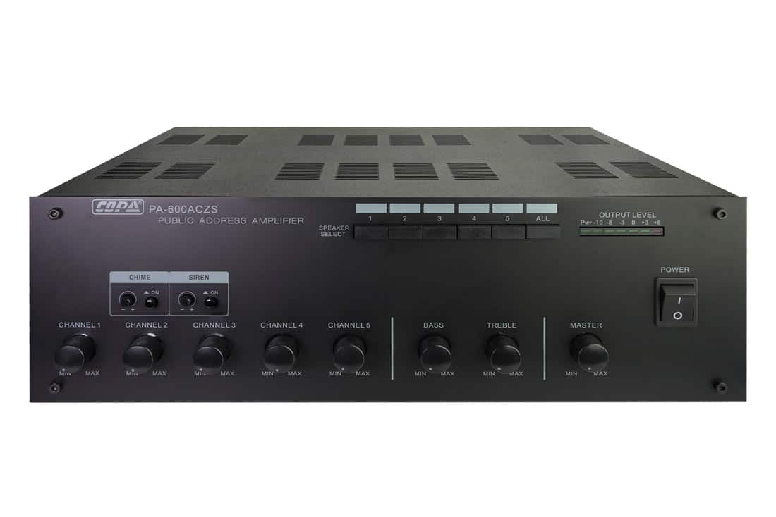 מגבר כריזה וסאונד בהספק 400/600W RMS תוצרת COPA TAIWAN יציאת רמקולים 100V / 8ohm בעל 2 כניסות מיקרופון + 2 כניסות AUX 2 כניסות נוספות לבחירה MIC/AUX כולל טעינת מצברים והשתקת מוזיקה (MIC1) כולל אוזניים לארון תקשורת “19 כולל 5 אזורים